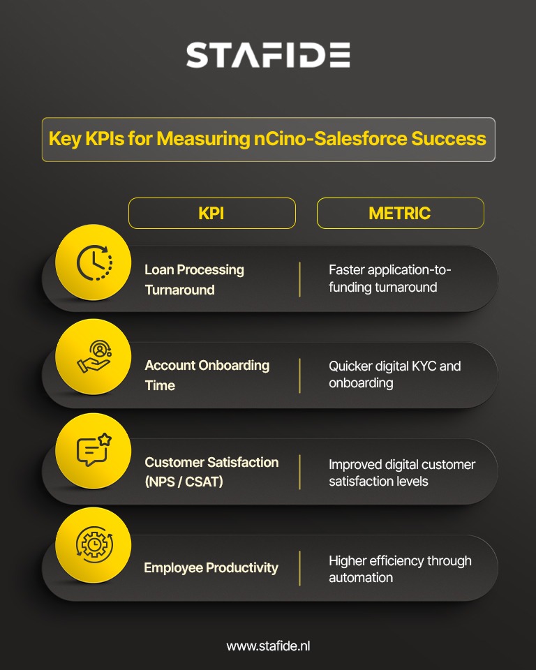 Tracking tangible results is crucial for evaluating the impact of nCino-Salesforce. Key performance indicators (KPIs) help institutions measure both operational efficiency and customer satisfaction. Common metrics include: