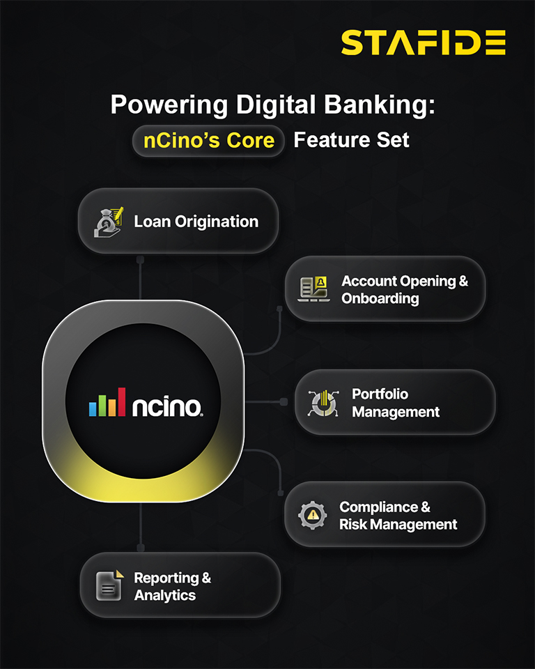 - Loan Origination: nCino automates the entire lending process, from customer application through credit analysis, approvals, documentation, and funding. Built-in analytics and decisioning tools improve turnaround times while reducing human error. This is especially transformative for commercial and SME banking, where complex deals often face bottlenecks.